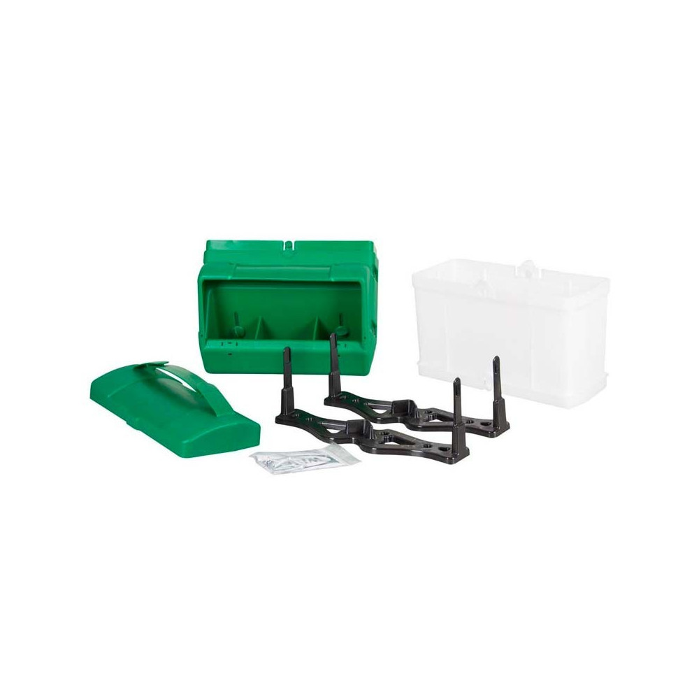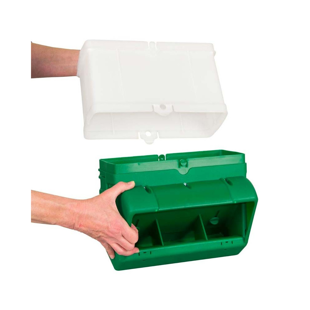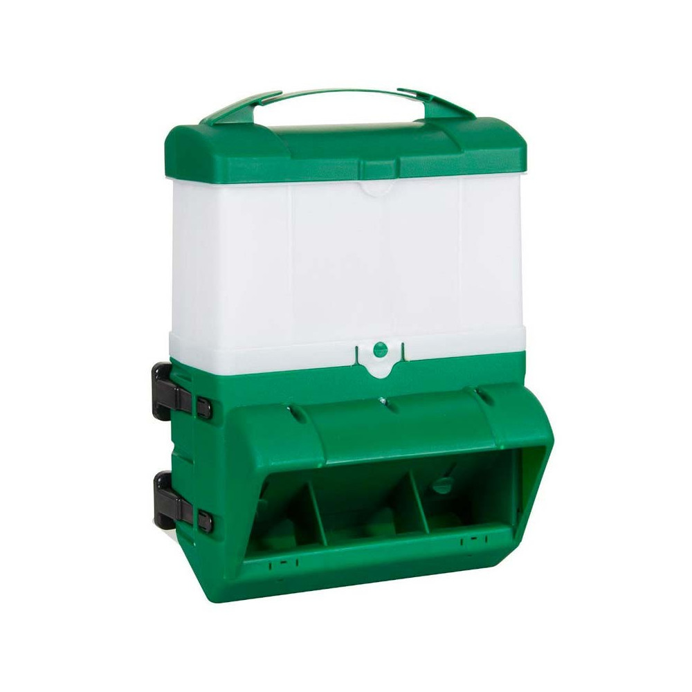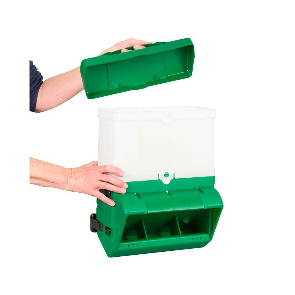 Ved at fastgøre sig til en væg eller hegn, er dette foderbræt fleksibelt. Med en indledende kapacitet på 10 kg foder, er det blot nødvendigt at tilføje en genopfyldning for at fordoble den. Udstyret med et låg, vil foderet være beskyttet mod vejrforholdene. Det Smart foderbræt kan installeres udenfor din voliere eller opdrætsbure for nem påfyldning. Genopfyldningerne klikkes sammen, ligesom adgangsrummet til foderet og låget. En lem gør det muligt at regulere kornets flow. I denne enkle konfiguration har foderbrættet dimensioner på 30 x 14 x 25 cm. Det er velegnet til både duer, ællinger/gæslinger og andre fjerkræ.