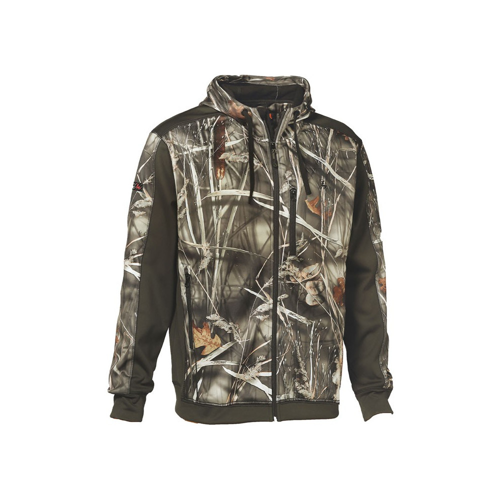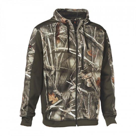 Dens camouflage roseaux Ghost Wet, kombineret med khakiindsatser, giver denne jakke et elegant design. Fremstillet af polyester med en indvendig fleeceforing gør den alsidig hele sæsonen. Wolf-jakken har en hætte med camouflageprint på ydersiden og khaki på indersiden og er udstyret med to lave lommer og en lynlåslomme på brystet. Wolf-jakken, signeret af Verney Carron, har også det store Pro Hunt-logo broderet på bagsiden.